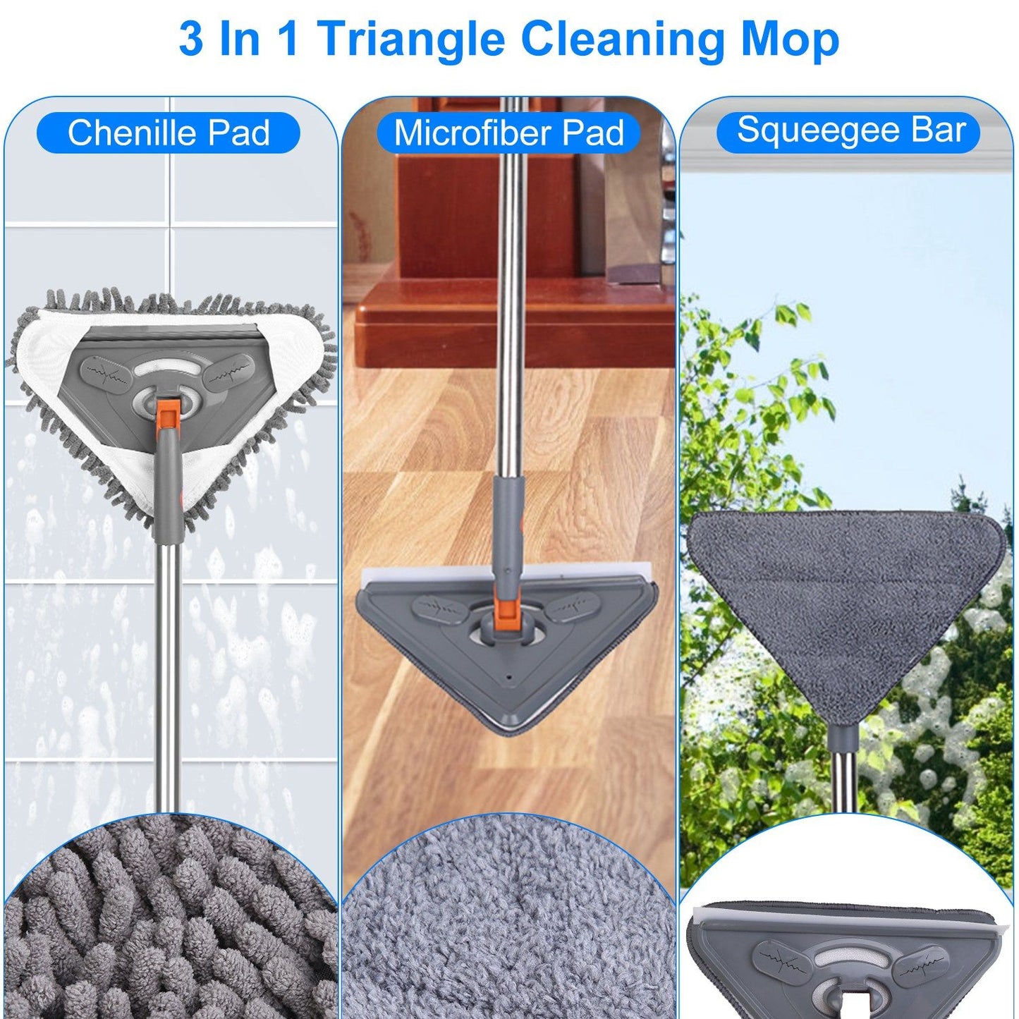 *360°Rotating Cleaning Mop*:This triangle cleaning mop enables you to rotate the mop head 180 degrees horizontally and vertically,as well as perform manual 360-degree turns. Specially designed for cleaning dead corners and hard-to-reach areas.