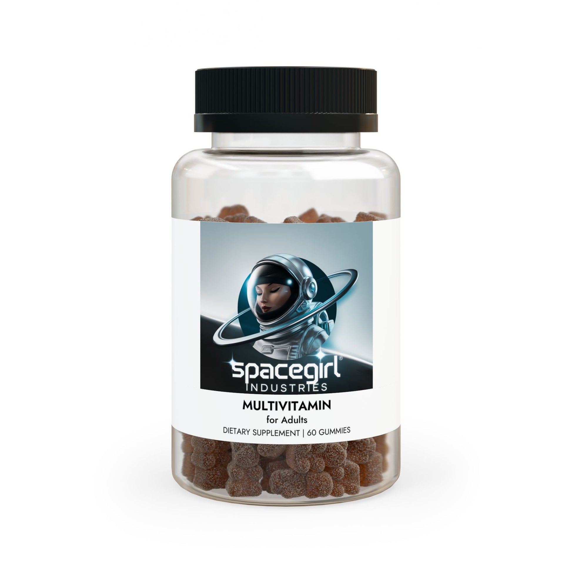 Multivitamin Gummies Supplement for adults without damaging your enamel with harsh liquids or leaving powder in your throat or compacted on molars before bed. This is a unisex Human health oriented Multivitamin blend. Here at Spacegirl Industries we over engineer the little stuff so your big day doesn't get ruined with decision making fatigue putting gummies in your mouth first thing in the morning. Let you treat you right. We offer a high bioavailable list of ingredients to support a lifestyle where you are the person you can rely on. Wouldn't you like to need other people less? Don't wanna stop for coffee on the way to work, how about another thirty minutes of sleep, and brewing your own coffee and eating some gummies while it brews. Doesn't that sound better than getting a cup of coffee with your name spelled wrong at the pickup window? Increase antioxidant support, support the conversion of food into cellular energy, and support hair health. Once again as always, with Spacegirl Nutrition, Whole-body health, all the time, Spacegirl Industries.