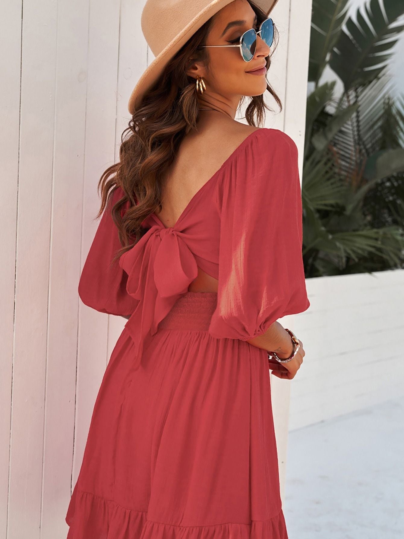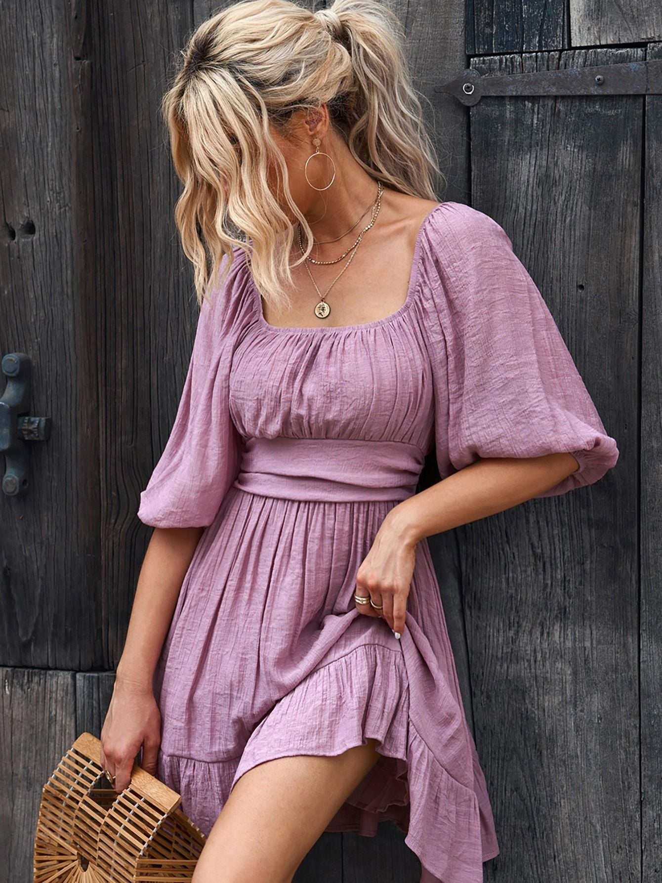 Women's Dresses Lantern Sleeves Dress; Square Neck Ruffle Back Lace Up Summer Dress; Women's Clothing